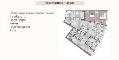 Первый этаж: Содержит 4 просторные зоны Open Space для сотрудников, уютную кухню, профессиональную переговорную и два санузла.