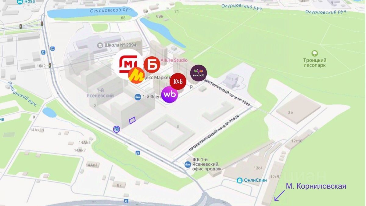 ЖК 1-й Ясеневский - крупный Жилой Комплекс в новой Москве. Численность жителей составляет около 7000 человек. Помещение расположено в центре жилого массива по пути следования от автобусной остановки и метро. Витринные окна, высокие потолки 4,74 м, возможность согласования антресоли, место под вывеску. Помещение хорошо просматривается и имеет высокий рекламный потенциал для арендатора, открытая планировка. Выделеная электрическая мощность - 18 кВт с возможностью увеличения. Широкий спектр потенциальных арендаторов, помещение подойдет под разные виды бизнеса. Потенциальная арендная ставка - 3 200 руб./м2, МАП - 300 000 руб./мес.
