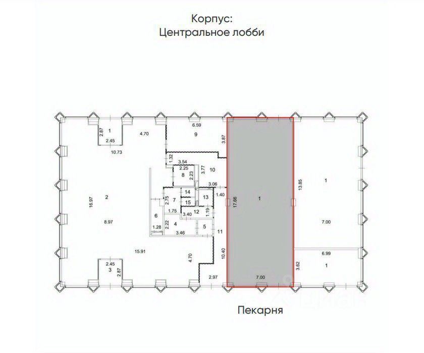 Помещение пристроено к двум 43-этажным высоткам, соседняя дверь от центрального лобби ЖК.