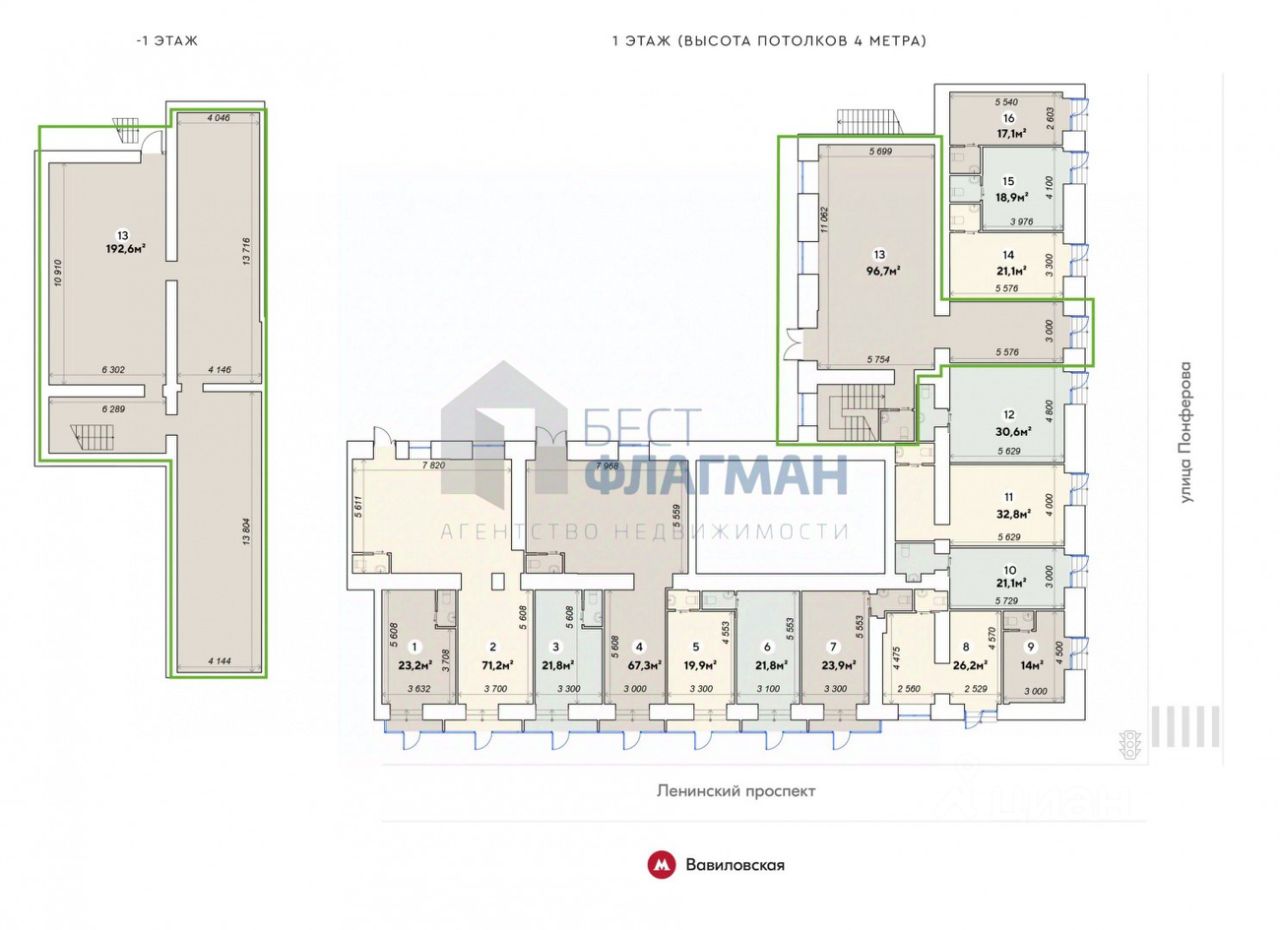 Помещение без ремонта состоящее из 96,7 кв.м. на 1 этаже и 192,6 кв.м на -1 этаже, 3 отдельных входа с улицы включая на -1 этаж, высокие потолки 4 м, витринное остекление, мокрая точка, 20 кВт