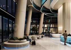 Пространства лобби обладают двусветной структурой, площадью до 500 кв. м, высотой потолков 8 м и витражным остеклением, что обеспечивает высокую степень естественного освещения.