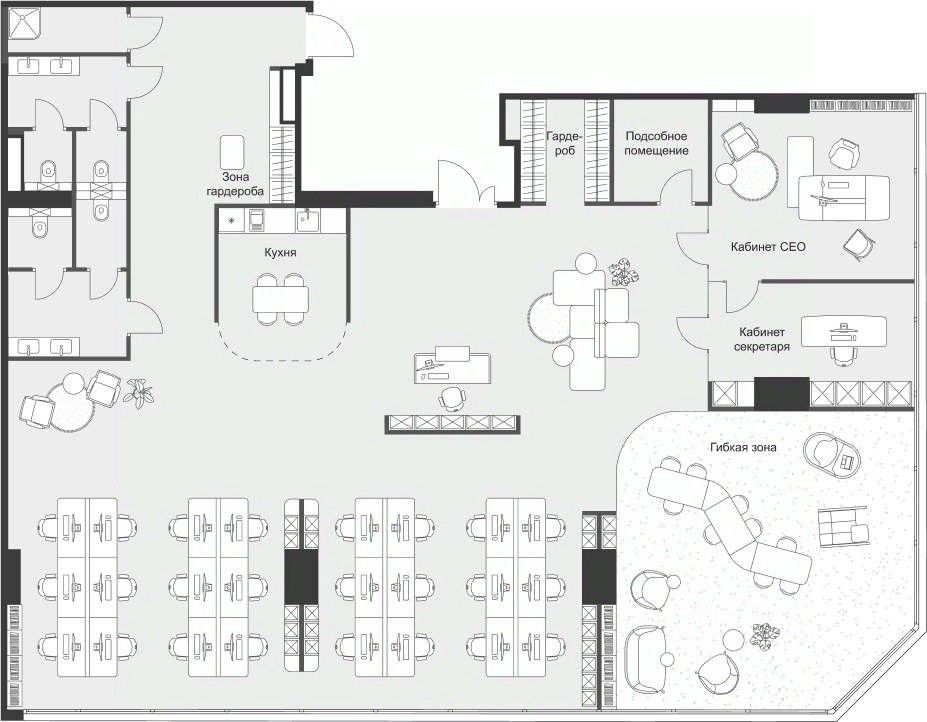 - Пространства без колонн в углах, идеально подходят для руководителей и современных команд.