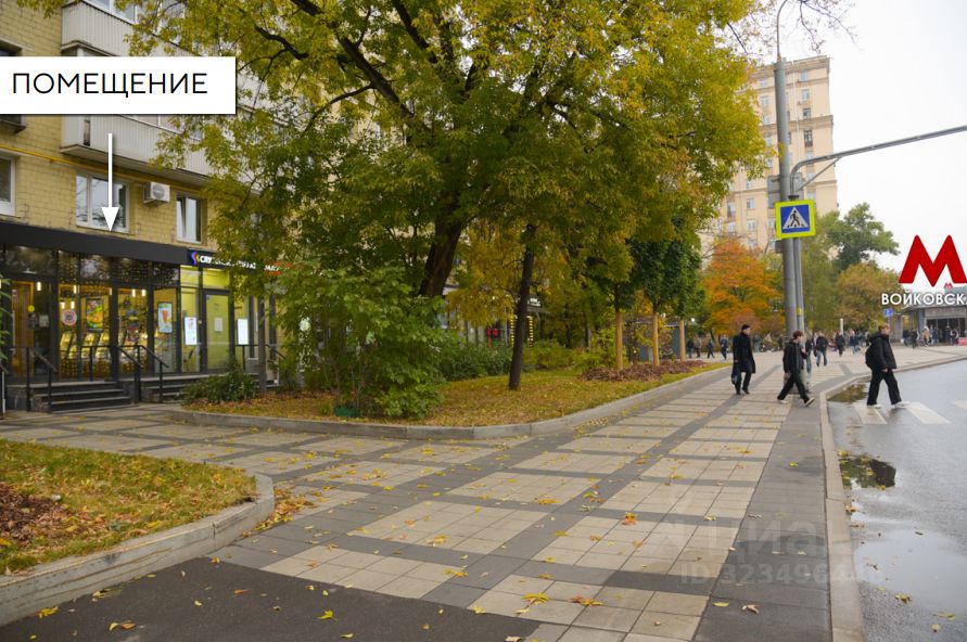 Помещение расположено у входа/выхода из метро "Войковская". Первая фасадная линия Ленинградского шоссе по направлению в центр. Густонаселенный район с развитой инфраструктурой и сложившимся торговым окружением. Интенсивный пешеходный и автомобильный трафик