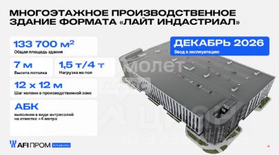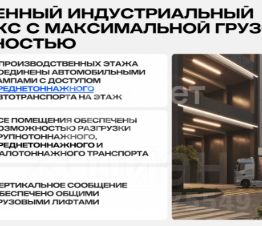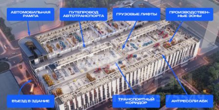 Это первый проект ramp-up factory в России, в котором грузовой транспорт сможет подъезжать к зонам разгрузки любого этажа по автомобильным рампам. В комплексе площадью 133 тыс. кв. м. будут располагаться 87 автономных коммерческих блоков размером от 800 до 2000 кв. м.
