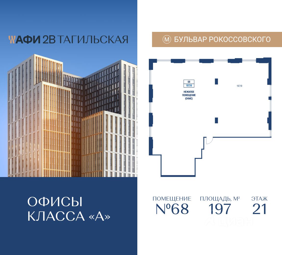 Продается коммерческое помещение общей площадью 197 м2 на 21 этаже в строящемся бизнес-центре АФИ2В Тагильская.