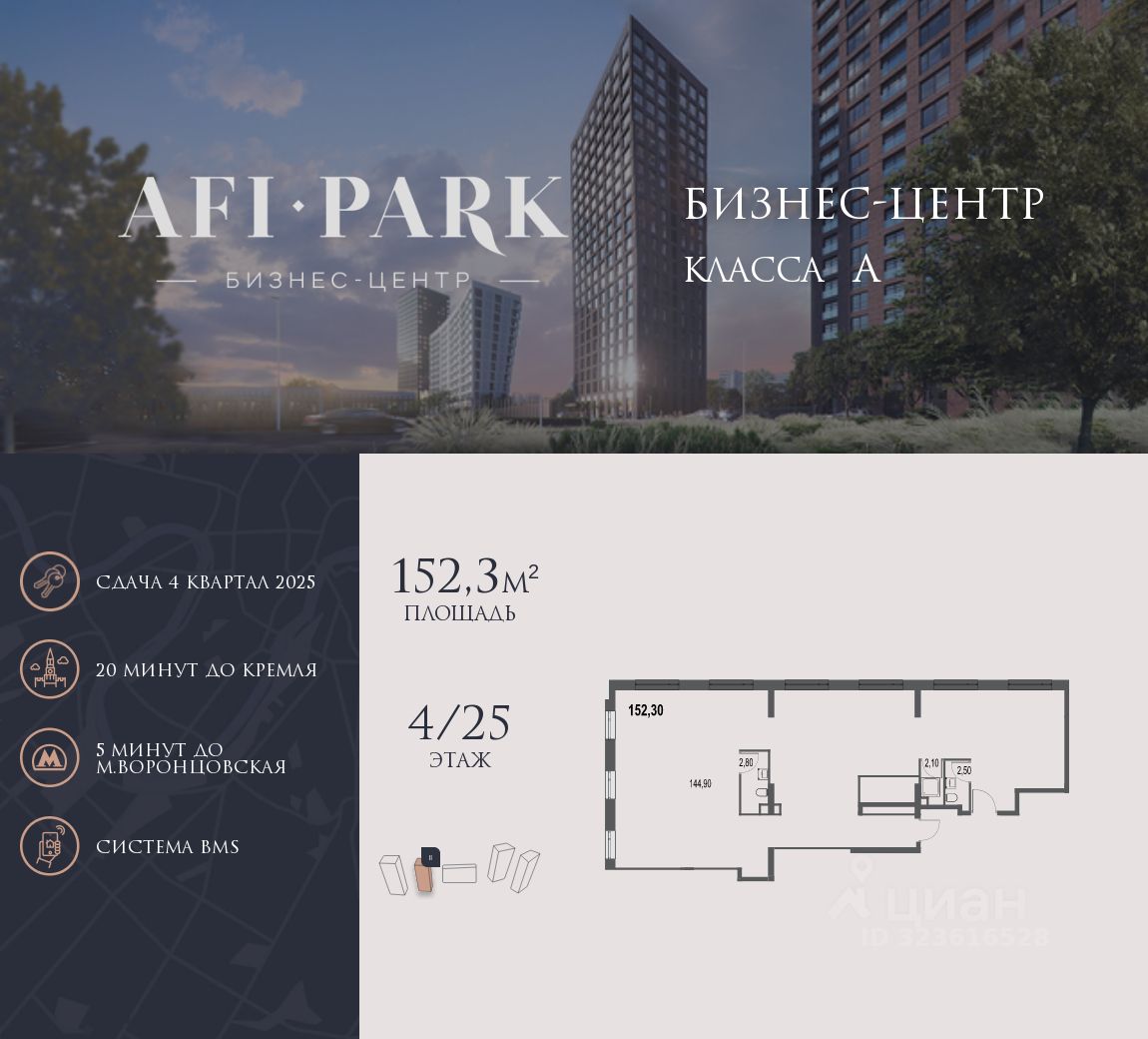 Продается просторное коммерческое помещение общей площадью 152,3 м2 на 4 этаже в строящемся бизнес-центре AFI Park.