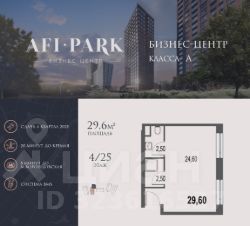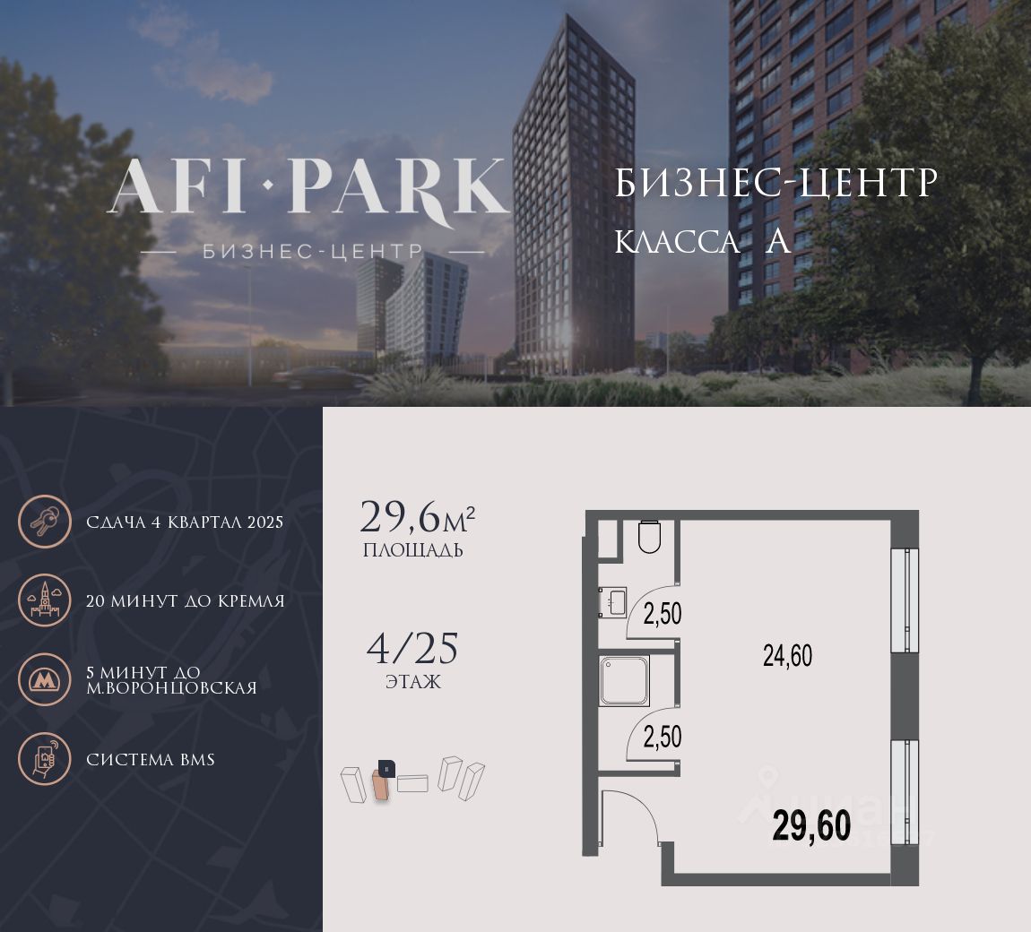 Продается просторное коммерческое помещение общей площадью 29,6 м2 на 4 этаже в строящемся бизнес-центре AFI Park.