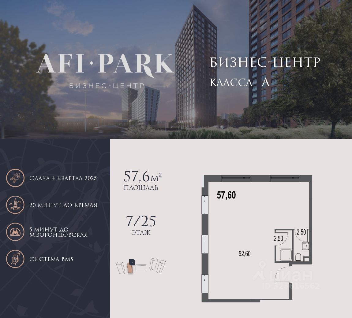 Продается просторное коммерческое помещение общей площадью 57,6 м2 на 7 этаже в строящемся бизнес-центре AFI Park.