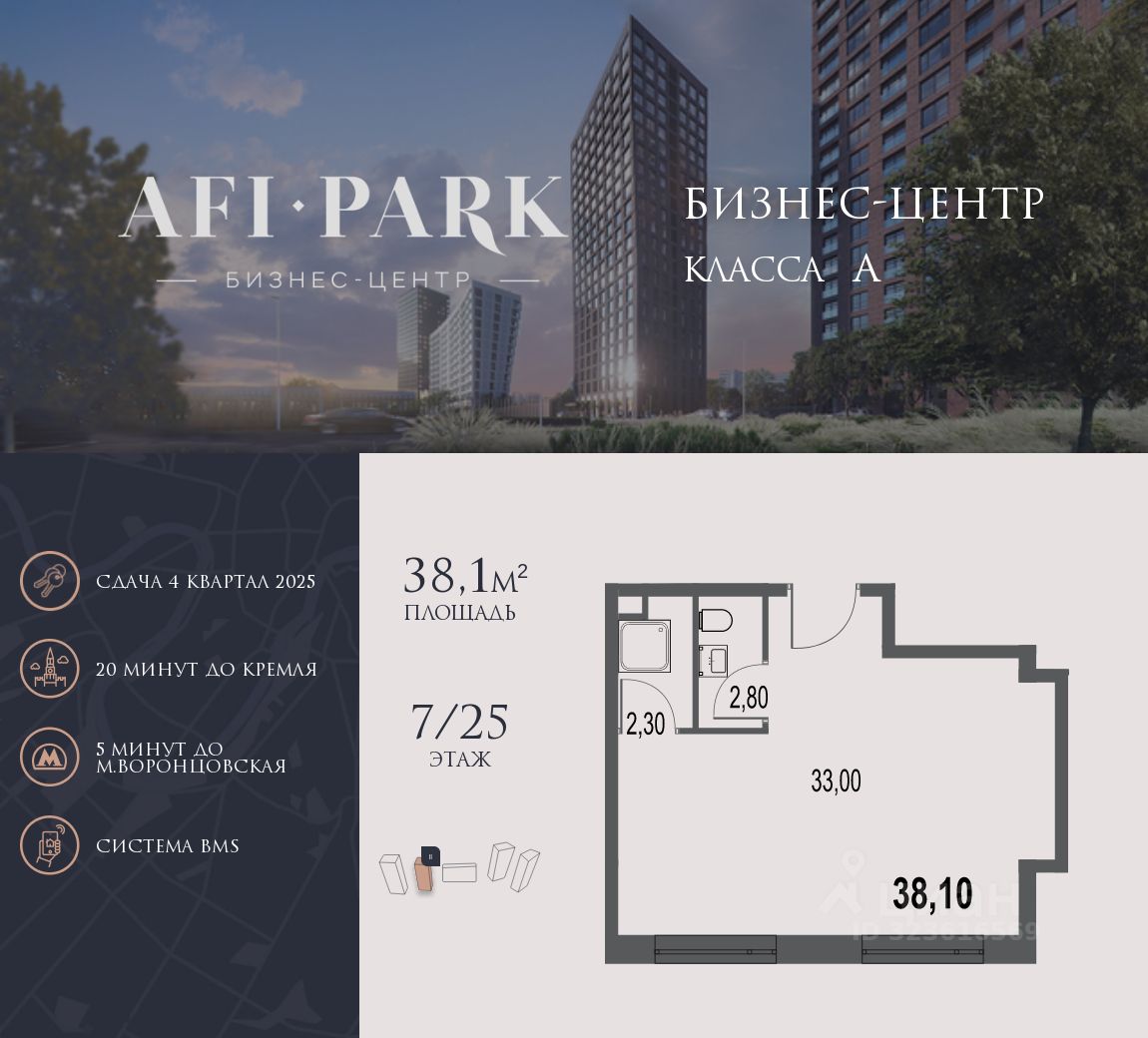 Продается просторное коммерческое помещение общей площадью 38,1 м2 на 7 этаже в строящемся бизнес-центре AFI Park.