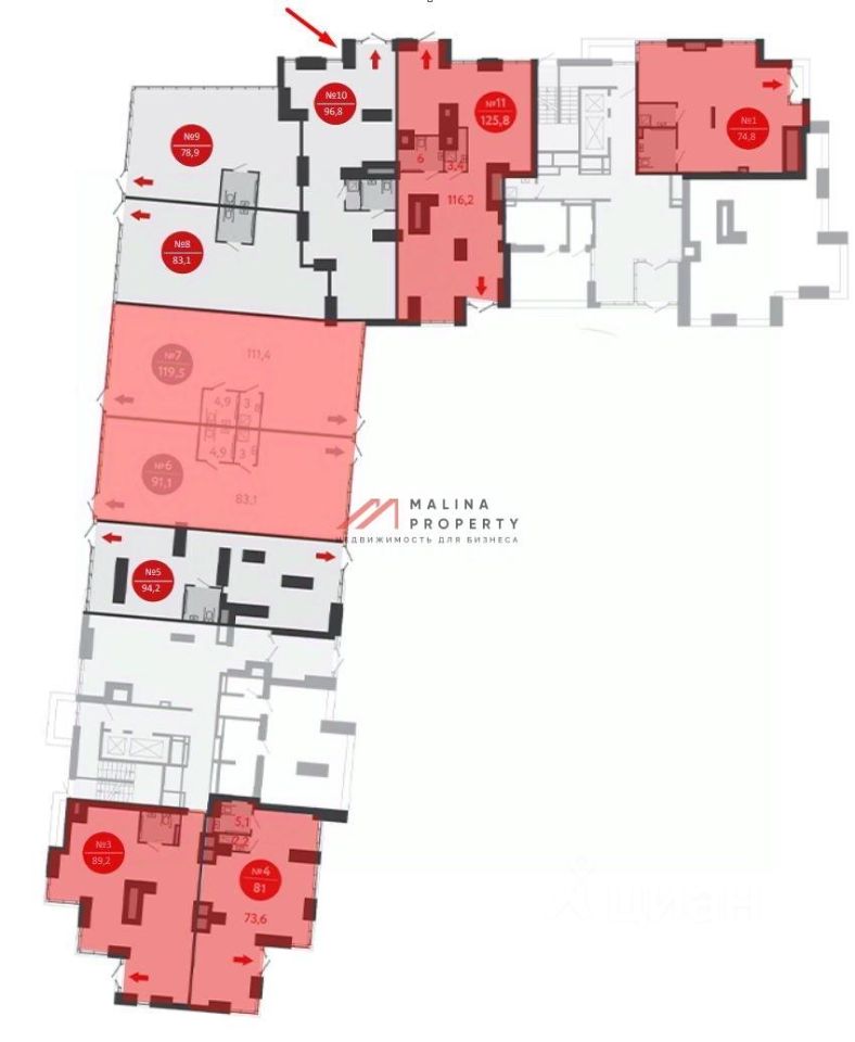 Помещение 96,8 м2 располагается на 1 этаже, открытая планировка, отдельный вход с фасада, высота потолка 4,5 м, витринные окна по фасаду. Электрическая мощность 200 Вт/м2, возможно увеличение.