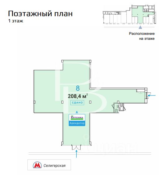 К покупке предлагается торговое помещение свободного назначения с арендатором. в 1 минуте пешком от станции метро "Селигерская". У помещения отличная пешеходная и транспортная доступность, рекламный потенциал и место для размещения вывесок. Высокий пешеходный трафик.