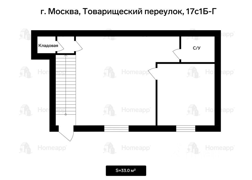 Площадь: 33 м² (подвал/цокольный этаж).