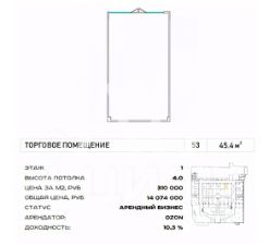 ГАБ. В продаже торговая площадь 45, 4 м2 по 310 000 р\м2. Стоимость: 14 074 000. Этаж 1, номер 1-53. Продается торговая площадь ( свободного назначения) в торговом центре BABYSTORE. ГАБ = арендатор Озон до января 2026г, окупаемость инвест\проекта 9 лет . Доп\расходы собственника: эксплуатационный платеж, налог за землю и налог на доход.