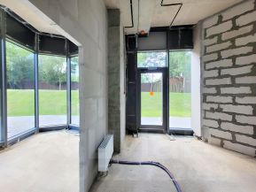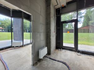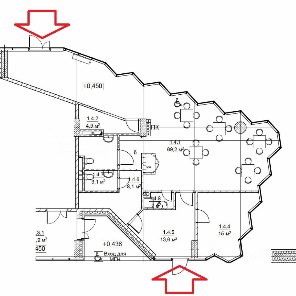 Помещение расположено на въезде в комплекс, в доме Юдашкина. Два отдельных входа, три санузла. Витринные окна на три стороны. Длина остекления по фасаду 48 м. Свободная планировка. Высокие потолки.