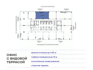 Видовые террасы и благоустроенная территория бизнес-центра предлагают не только удобные рабочие пространства, но и зоны для отдыха, где сотрудники смогут наслаждаться перерывами на свежем воздухе.