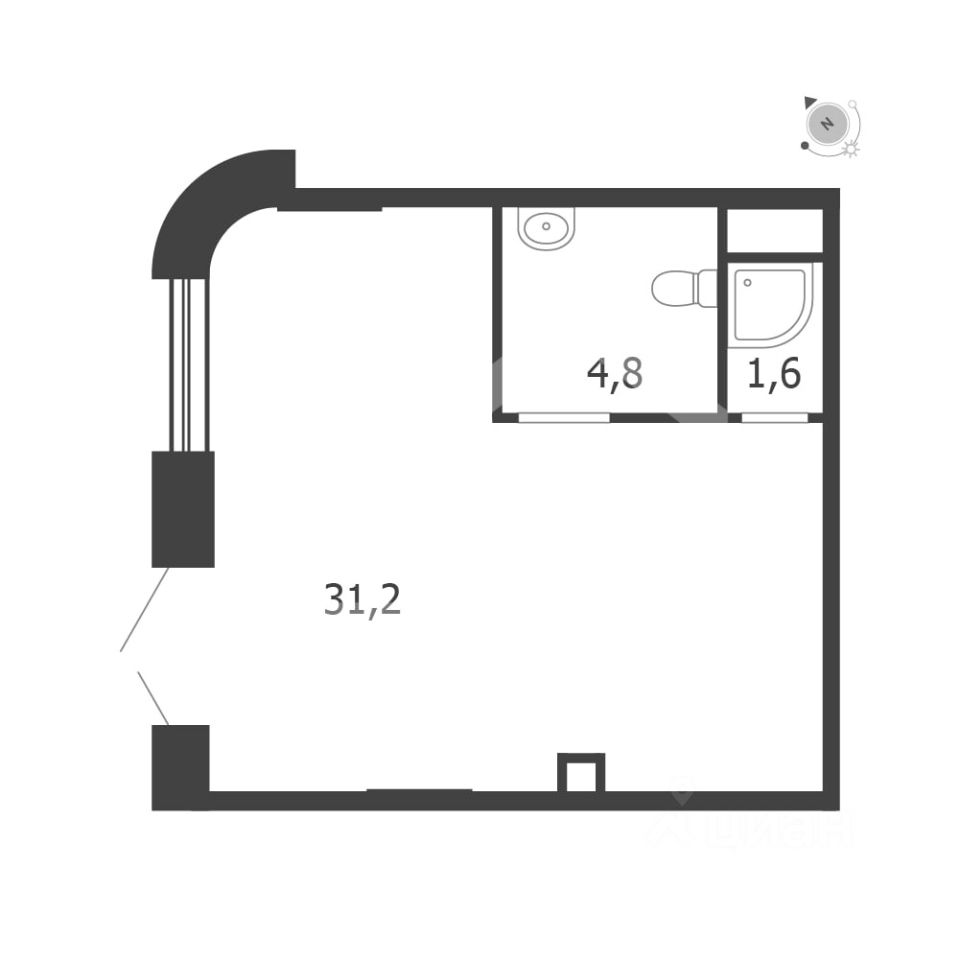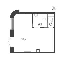 -основное помещение (31.2 кв. м), санузел (4.8 кв. м) и помещение для уборочного инвентаря (1.6 кв. м).