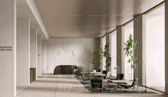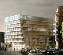 Девятиэтажное офисное здание аккуратно интегрировано в сформированную среду.