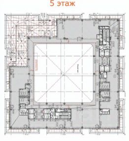 5 этаж - 1286 м2. Расчетная вместимость 107 рабочих мест. Есть выход на террасу и балконы
