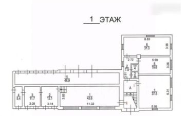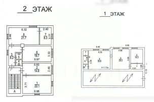 Первое здание двухэтажное, площадью 341.2 м2, при этом второй этаж присутствует только на части здания. Одноэтажная часть имеет высокий конек, что позволяет достроить второй этаж, увеличив площадь на 120 м2.