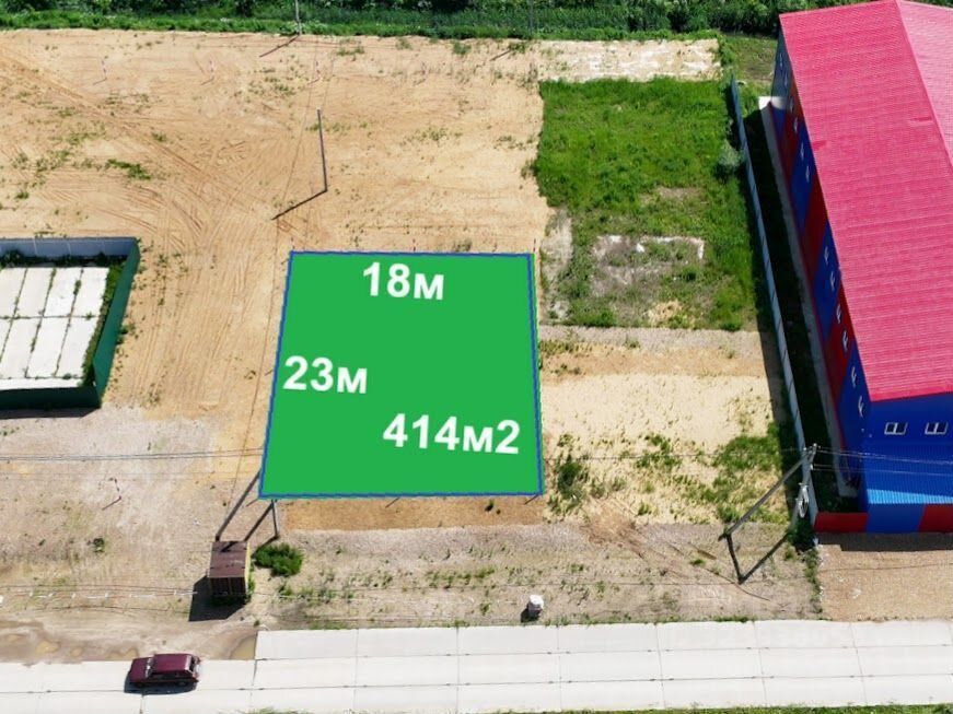 • Площадь: 4,1 сот. (414 м²), ориентир 1823 м, прямоугольник, ровный рельеф.