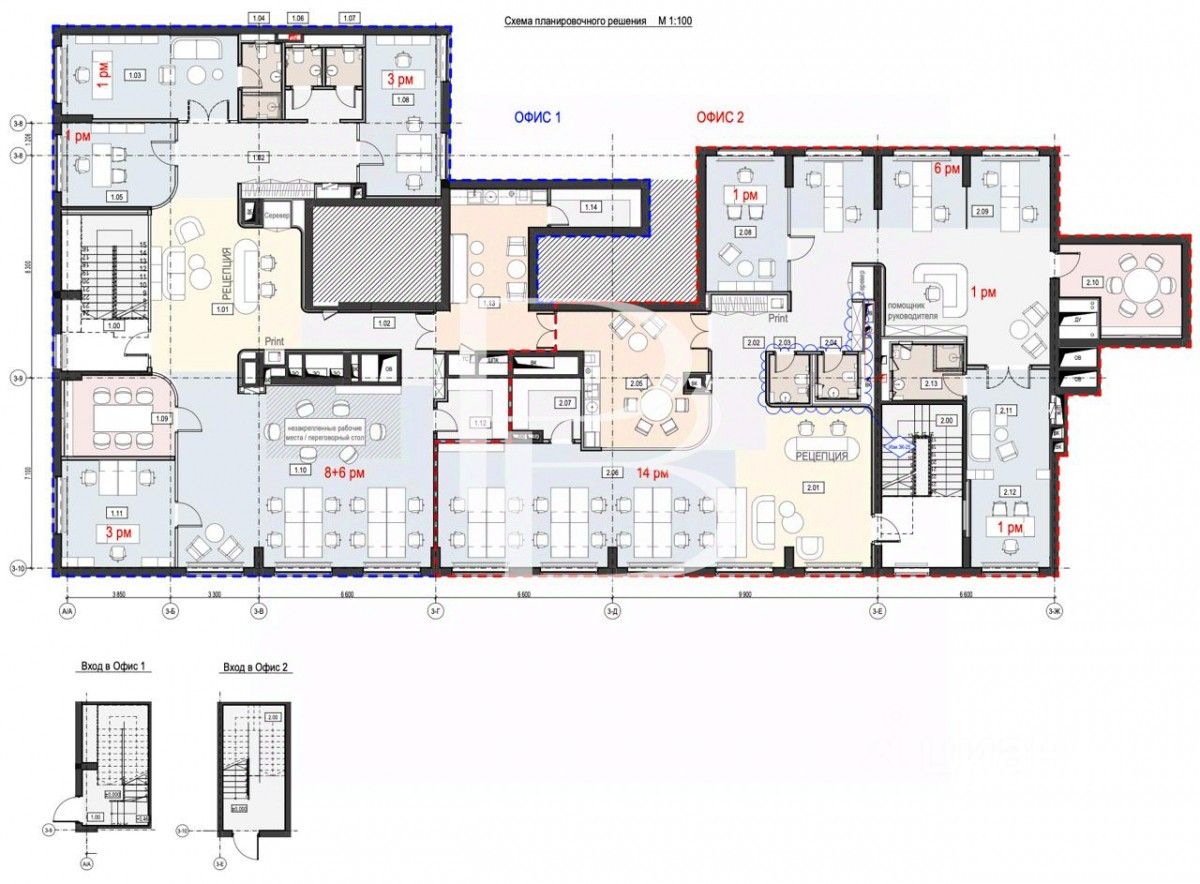По плану обустроены: рабочие залы, кабинеты руководителей, бухгалтеров, ПТО, переговорные, санузлы, гардеробы, архивы, серверные.