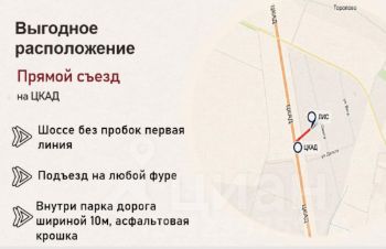 Прямой выезд на ЦКАД. Шоссе без пробок первая линия. Подъезд на любой фуре. Внутри парка дорога шириной 10м, асфальтовая крошка.