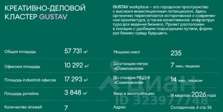 Продается строящееся помещение под офис-производство-склад-хранение-шоу-рум нового поколения Light industrial офис в центре Москвы. Креативно-деловой кластер GUSTAV . Незаменимый формат современного бизнеса. Высокая востребованность сейчас и в будущем. Площадь продающихся industrial-офисов = 17 000 м2. 15 лифтов. Мощность до 1000 кВт. В подземный паркинг может заехать грузовая машина высотой до 2,9 м. Ввод в эксплуатацию - 3 квартал 2026г. Далее- Готовый Арендный Бизнес при желании.
