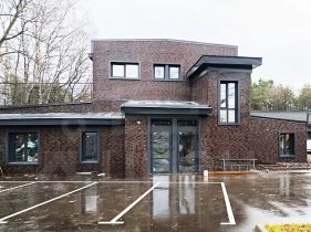 Отделка фасадов выполнена панелями с имитацией клинкерного кирпича. Дополнительно на территории организованы зоны отдыха, имеется возможность для организации летних веранд и кафе.
