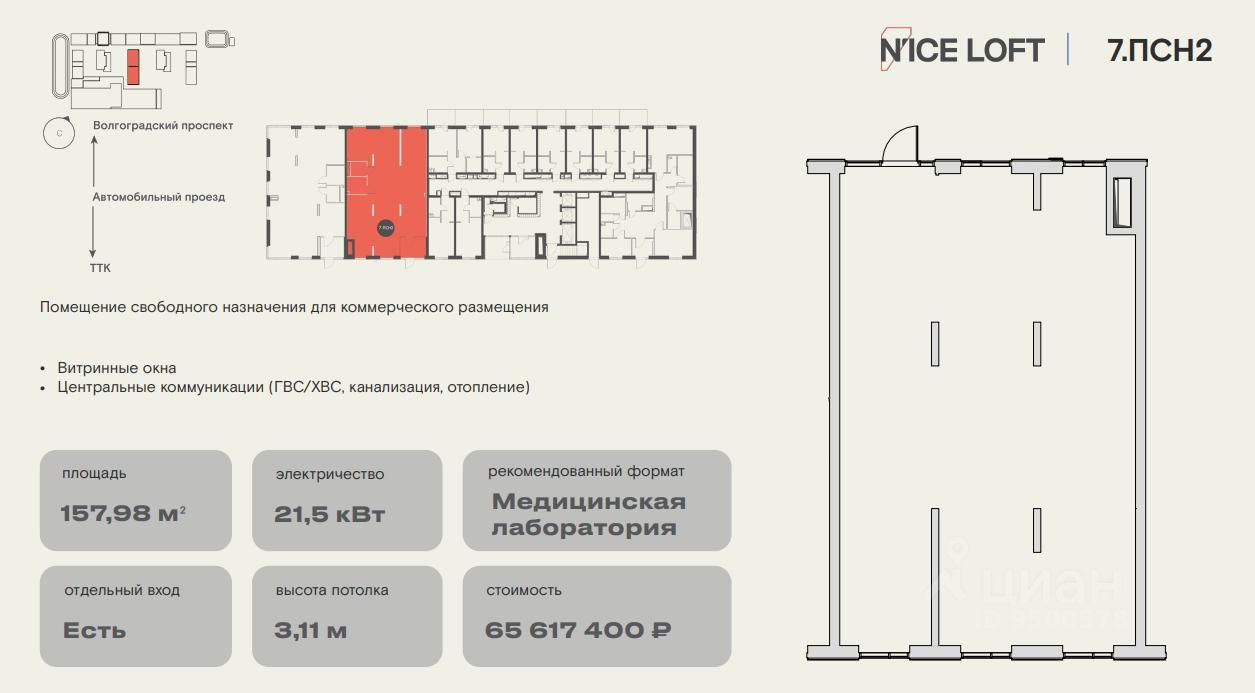 Лот: 37972. Помещение свободного назначения формата Street Retail в ЮВАО Москвы в ЖК N`ICE LOFT. Расположено на первой линии домов. Выезд на автомобильный проезд. Плотный жилой массив. 8 минут пешком до МЦД-2 Калитники. Рядом остановка общественного транспорта. Центральные коммуникации (ГВС/ХВС, канализация, отопление).