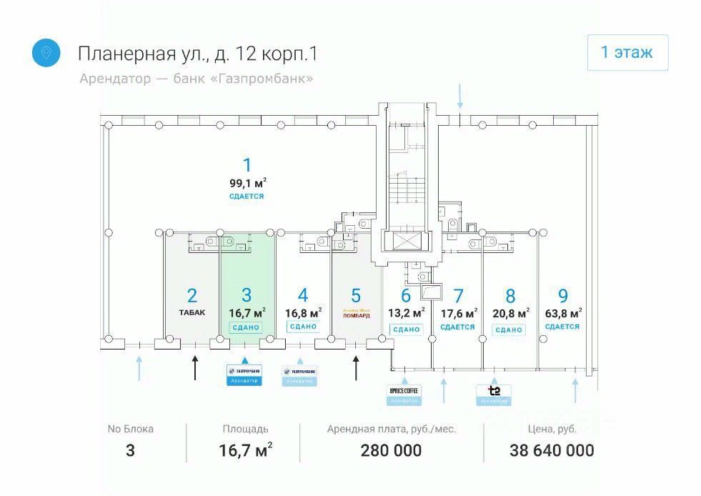 Лот: 37980. Помещение свободного назначения формата Street Retail в СЗАО Москвы. Шаговая доступность от ст. метро "Планерная" — 1 минута пешком. Отличная пешеходная и транспортная доступность. Помещение расположено в крупном сложившемся жилом районе с высокой плотностью застройки и развитой инфраструктурой. Арендатор: Газпромбанк. МАП: 280 000 руб.