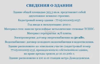 Здание расположено в 100 м от станции метро Домодедовская. Прямая продажа. Предусмотрен торг на ноябрь