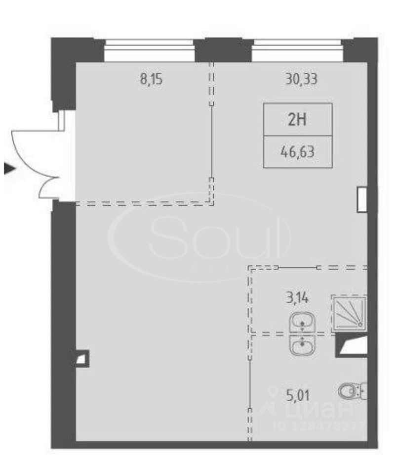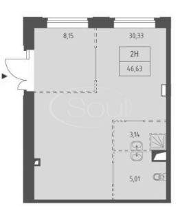 Объект имеет открытую планировку, высоту потолков 4 метра, отдельный вход и электрическую мощность 9 кВт. Все коммуникации центральные. Дом введён в эксплуатацию до 30 июля 2025 года, застройщик — ГК "Самолёт".