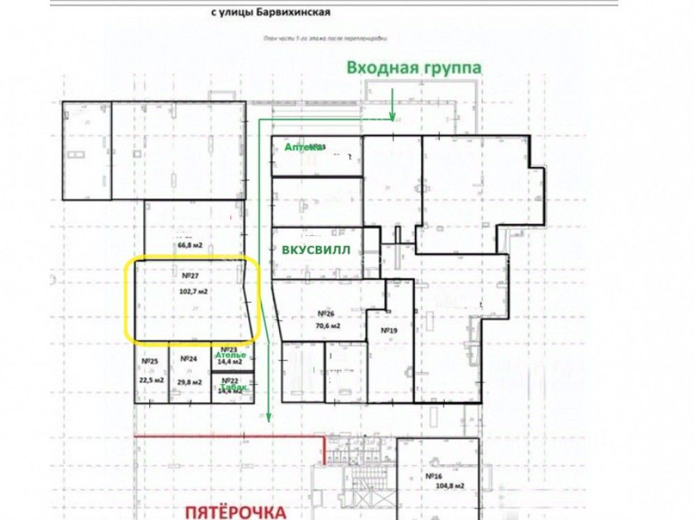 1-ый этаж жилого 10-этажного дома. Общая площадь 102,7 м², Прикассовая зона супермаркета "Пятёрочка". Отдельный вход, витринное остекление, открытая планировка. Мощность электроэнергии 28 кВт. Высота потолков - 4 м.