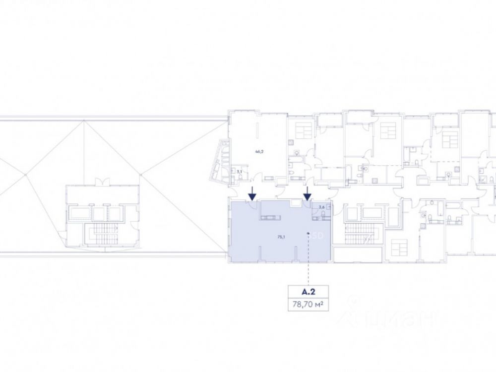 Площадь - 78,7 м2; 2 входа в помещение; Помещение в двух уровня; Высота потолков 3,5 м; Мокрая точка.