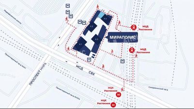 МФК "Мираполис" расположен в 3-х минутах ходьбы от ТПУ Ростокино с пересадкой с МЦД на МЦК, что обеспечивает большой трафик ежедневно.