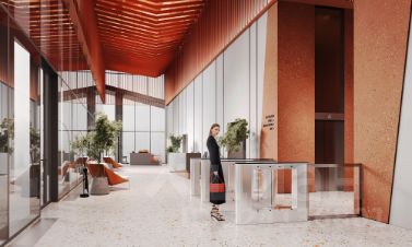 Гостей и сотрудников бизнес-центра встречает яркое лобби с девятиметровыми потолками и витражным остеклением. Также на первом этаже располагается ритейл с магазинами, аптекой и кафе.