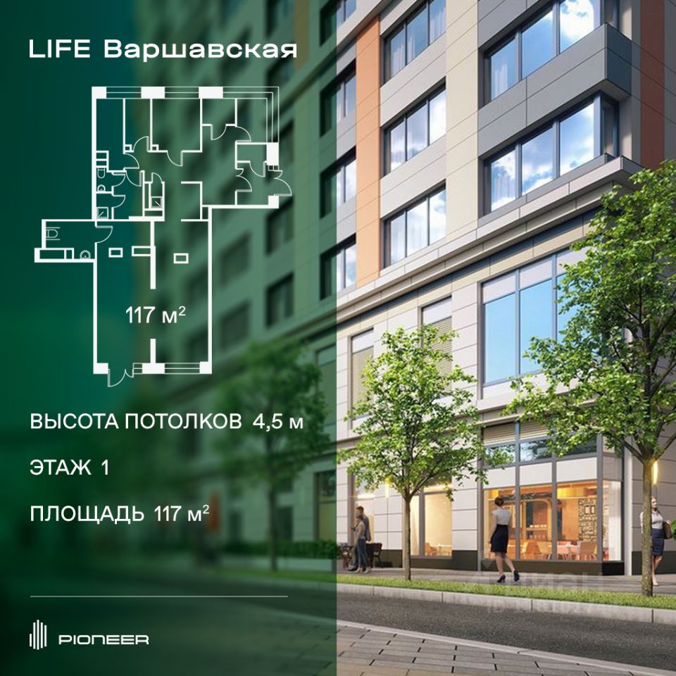 Продается ПОМЕЩЕНИЕ СВОБОДНОГО НАЗНАЧЕНИЯ площадью 117 м² в ЖК "LIFE Варшавская", отдельный вход с фасада, шаговая доступность от метро Варшавская, помещение расположено в Корпусе 6, интенсивный трафик, первая линия домов. Расчетное количество жителей жилого комплекса 15 000 человек, охват района 70 000 человек, активно строящийся район Москвы.