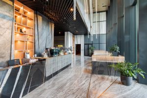 1-я очередь. Секция А1 (Гранд лобби), которое оснащено просторной мягкой зоной ожидания, двумя переговорными комнатами и выходом на закрытую благоустроенную территорию.