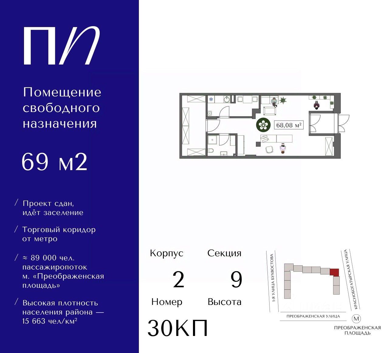 Цена указана с учетом скидки. В проекте премиум-класса "Преображенская площадь" предлагаются к продаже коммерческие помещения. Потенциальная доходность:Продажа помещения в готовом состоянии- Срок инвестиции 4 года;- Годовая доходность 12%Сдача помещения в аренду- Срок инвестиции 8-10 лет;- Годовая доходность 14%Сдача в аренду и продажа как ГАБ- Срок инвестиции 5 лет;- Годовая доходность 14% Преимущества:- Помещения свободного назначения от 44м² до 235²;- Широкоформатное остекление;- Высота потолков до 4,18м;- 89 000 человек пассажиропоток м. "Преображенская площадь";- Торговый коридор от метро;- Высокая плотность населения - 15 663 чел/км²;- Множество зон отдыха вокруг;- Развитая социальная инфраструктура;- Сдача I очереди ЖК III-кв. 2024; Центр рядом:- 7 минут на автомобиле до ТТК;- 8 минут до Садового кольца;- 1 минута до м. "Преображенская площадь".