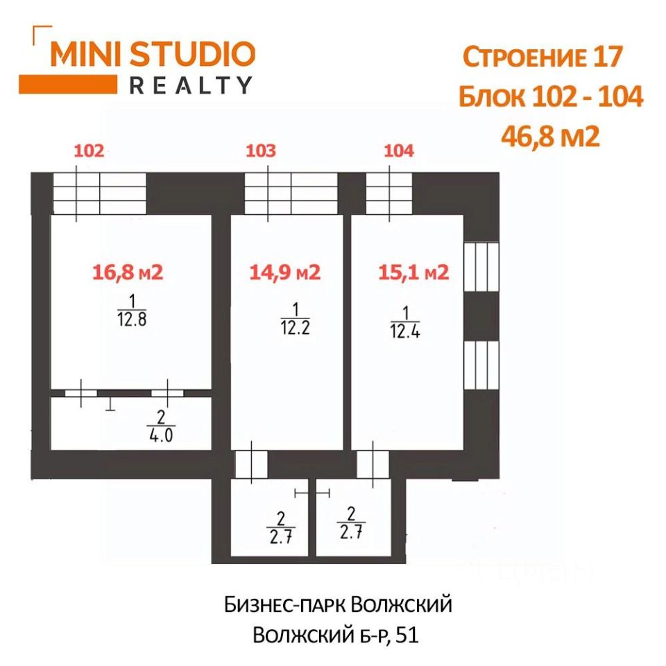 3 отдельных входа: 16,8+14,9+15,1 кв.м на 1 этаже в Бизнес-парке Волжский.