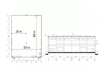 Двухпролетная система 15х2 с шагом 6 , ряд колонн по центру. Складская зона 30х42. Пристроенная АБК в 2 этажа 9х12 с шагом 4,5х6, в центре 1 колонна.