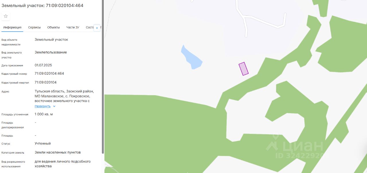 продажа земельного участка из земель населенных пунктов с кадастровым номером 71:09:020104:464, площадь 1000 кв. м, адрес: Тульская область, Заокский район, МО Малаховское, с. Покровское, восточнее земельного участка с кадастровым номером 71:09:020104:198, вид разрешенного использования: для ведения личного подсобного хозяйства