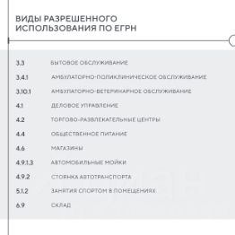 Деловое управление (4.1); Торгово-развлекательные центры (4.2); Магазины (4.4); Общественное питание (4.6); Автомобильные мойки (4.9.1.3); Стоянка транспортных средств (4.9.2); Обеспечение занятий спортом в помещениях (5.1.2); Склад (6.9); Бытовое обслуживание (3.3); Амбулаторно-поликлиническое обслуживание (3.4.1);