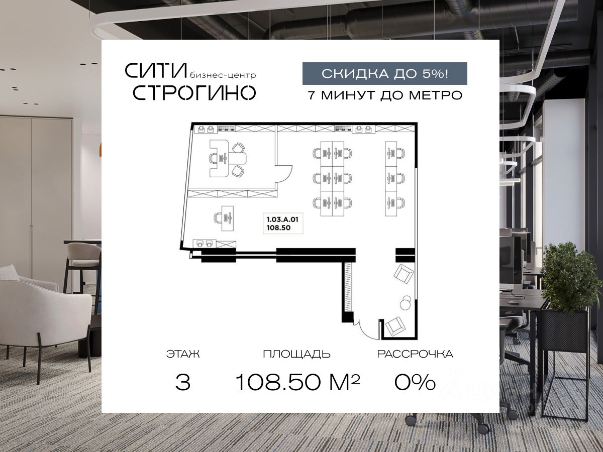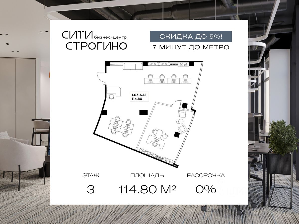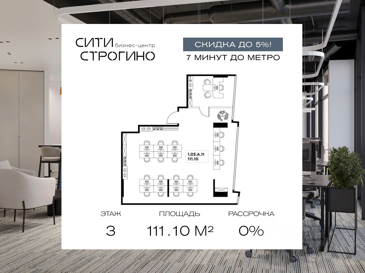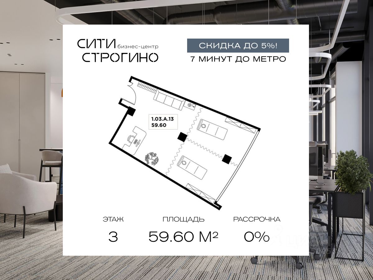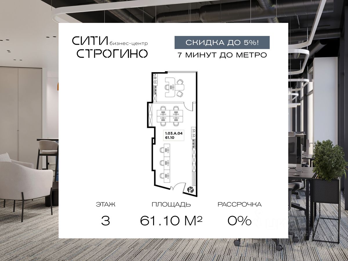 В продаже от застройщика комфортабельные Smart-офисы площадью от 59.6 до 148.6 м² на 3 этаже в премиальном бизнес-центре Сити Строгино. Срок сдачи - 2028 год.