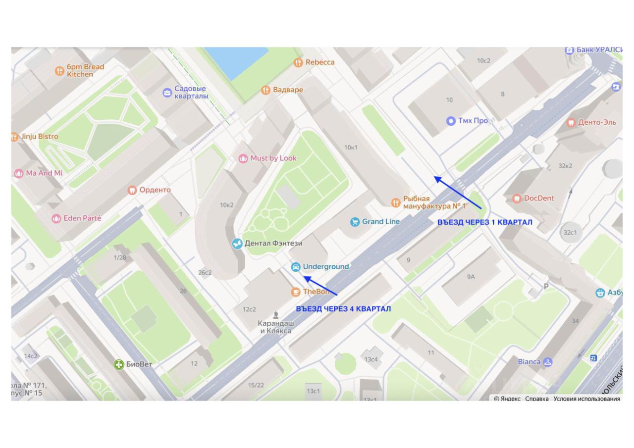 Два въезда в паркинг. Основной въезд с ул. Ефремова, Квартал 4 (со стороны Клиники). Второй въезд со стороны ул. Ефремова, Квартал 1 (со стороны Рыбная мануфактура). На гостевую парковку Квартала 4 удобно въезжать через Квартал 1. Машино-место расположено вблизи входа в секцию Г