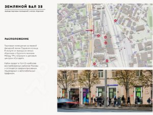 Торговые помещения на первой фасадной линии Садового кольца. В минуте ходьбы от выхода из метро Курская и Курского вокзала. Помещения расположены между ТРЦ Атриум и деловым центром Ситидел. Сверхинтенсивные пешеходные и автомобильные потоки. Развитая торговая и деловая инфраструктура.