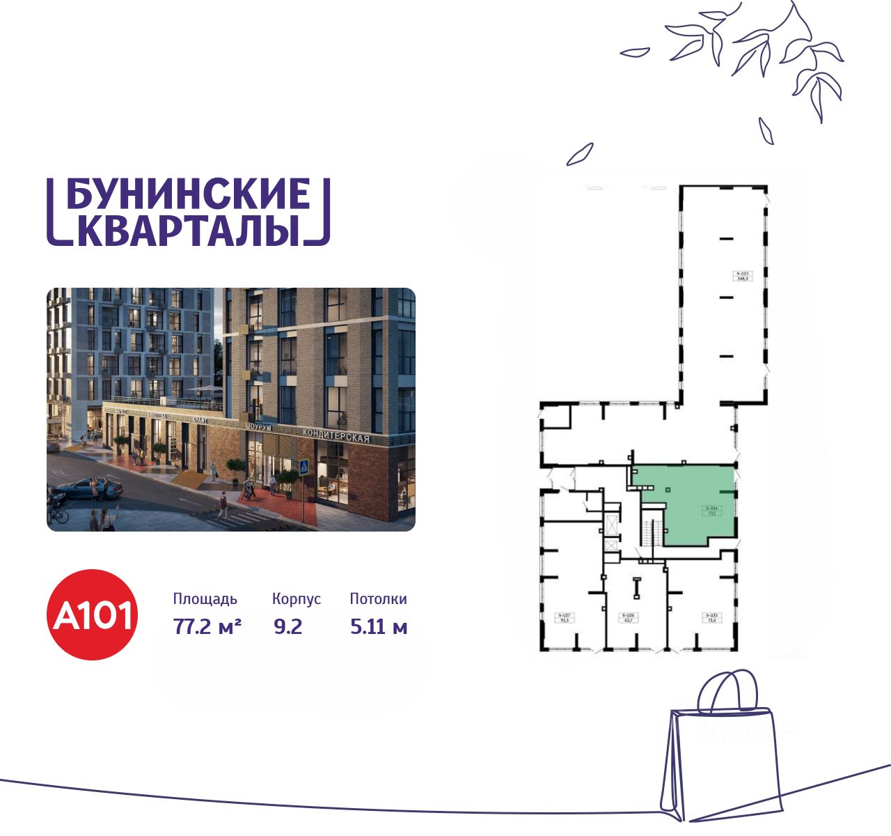 Продается торговое помещение площадью 77.20. на 1-м этаже ЖК "Бунинские кварталы".