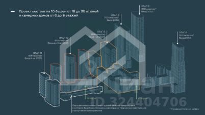 -ЖК состоит из 9 корпусов переменной этажности (от 8 до 29 этажей), рассчитанных на 2 150 квартир;