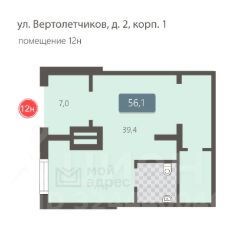 Коммерческое помещение площадью 56.1 м², расположено по адресу: г. Москва, улица Вертолётчиков, 2к1, помещение 12Н, район Некрасовка. Объект занимает 1 этаж в здании с этажностью 26 этажей. Помещение без отделки, свободного назначения, имеет отдельный вход.