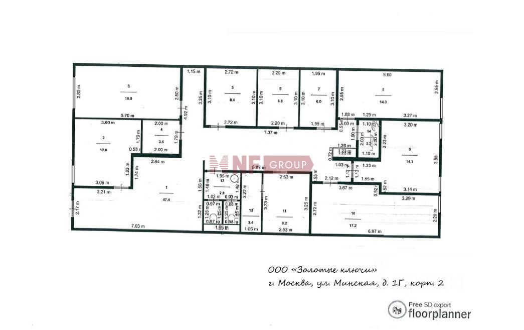 Планировка: основной холл с ресепшн и торговой зоной, зона ожидания, два санузла, кухня, шесть изолированных рабочих кабинетов, подсобные помещения.